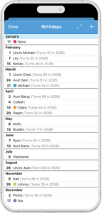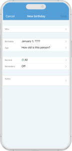 When you tap on birthdays in Cozi Gold, a page opens where you can enter all your important birthdays. Tap the + key to add each new birthday. When you do, you’ll be given options to set reminders and who will get them: