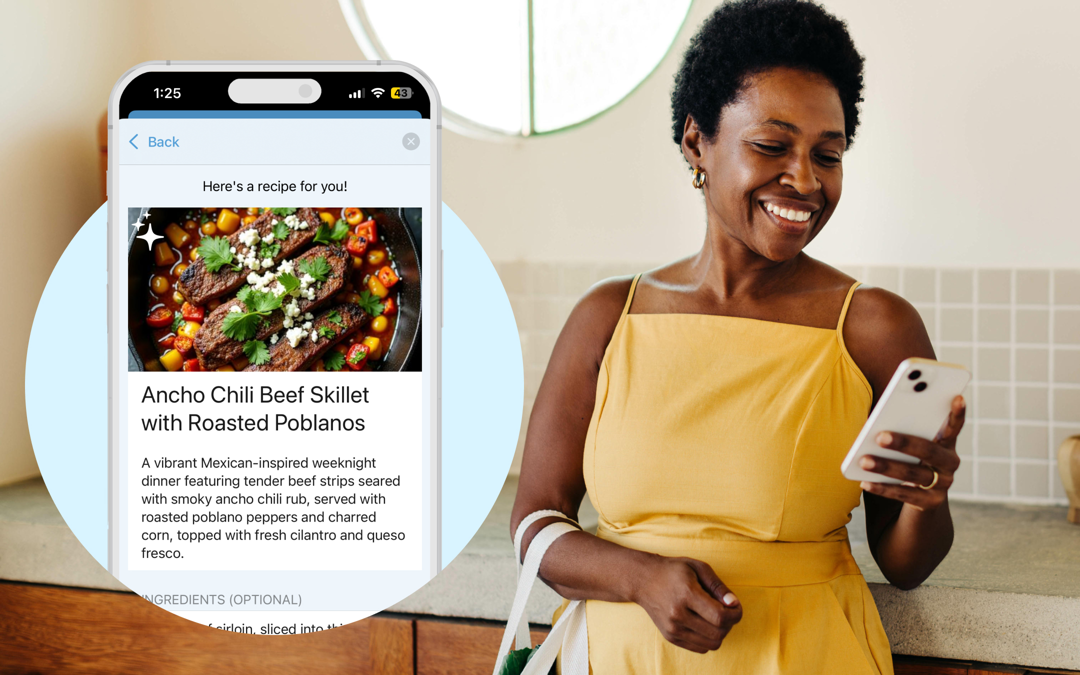 Woman in a yellow dress looking at Cozi Max meal planner feature on her mobile phone.